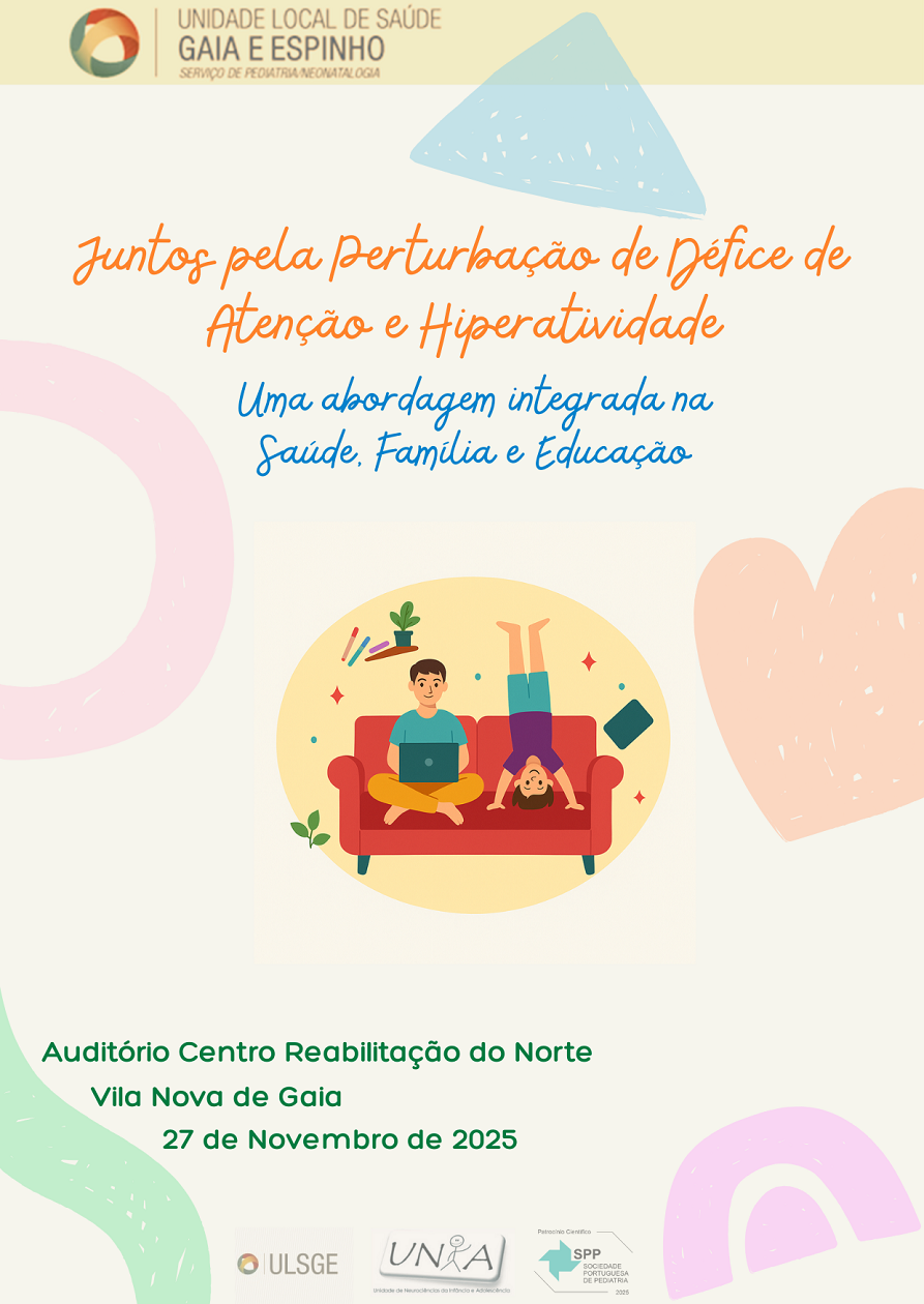 Temática: Perturbação de Hiperatividade e Défice de AtençãoResumo: A Consulta de Desenvolvimento da Unidade de Neurociências da Infância e Adolescência (UNIA) do Serviço de Pediatria e Neonatologia da Unidade Local de Saúde Gaia e Espinho (ULSGE) organiza o 3º Curso de Neurodesenvolvimento Infantil – Juntos pela Perturbação de Défice de Atenção e Hiperatividade - uma abordagem integrada na Saúde, Família e Educação, que irá realizar-se no próximo dia 27 de novembro de 2025, no Auditório do Centro de Reabilitação do Norte, em Vila Nova de Gaia.