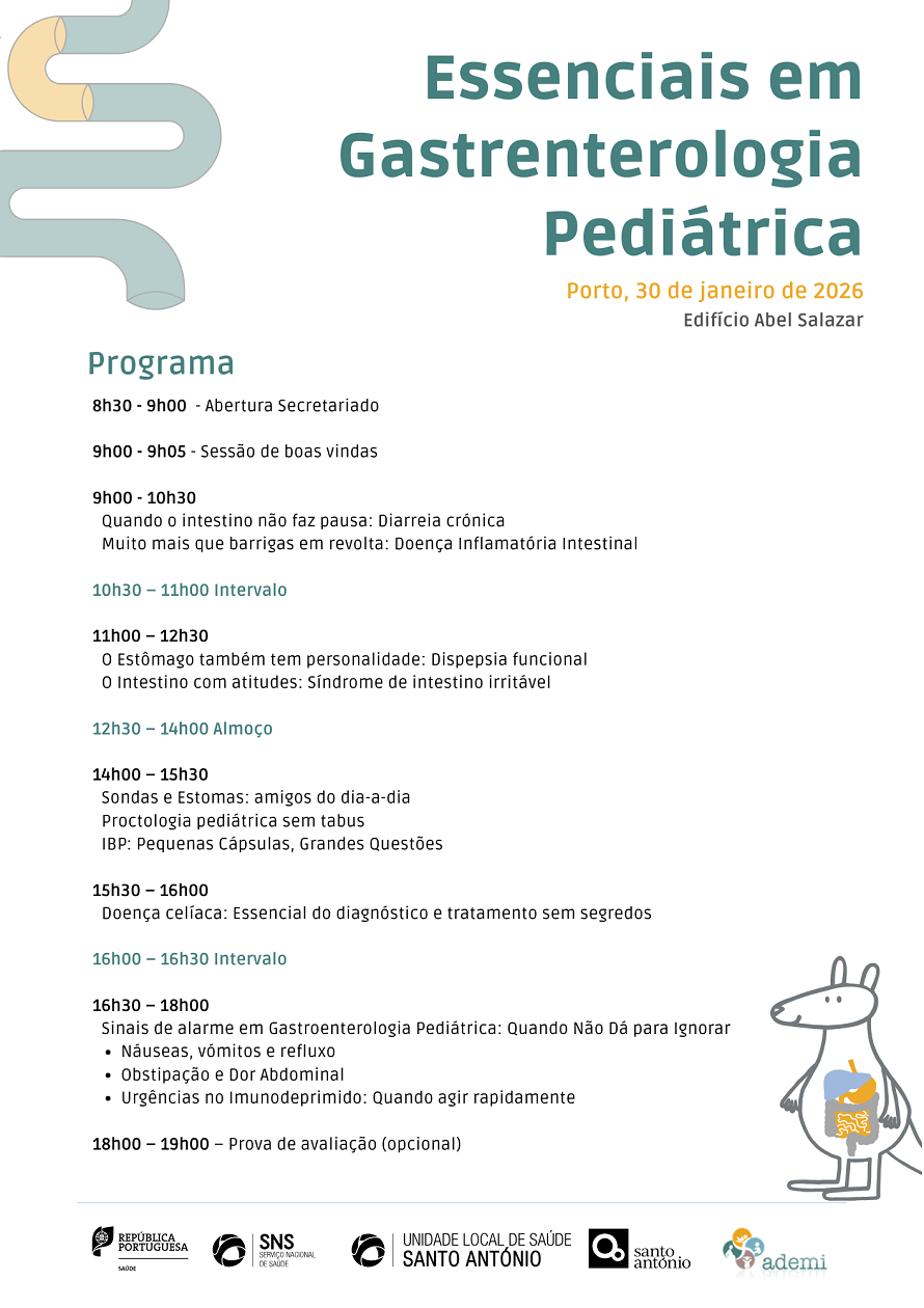 Resumo: O curso Essenciais em Gastrenterologia Pediátrica, organizado pela Unidade de Gastroenterologia Pediátrica do Centro Materno Infantil do Norte decorrerá a 30/01/2026, no Edifício Abel Salazar do ICBAS/UP. este curso destina-se a médicos internos e especialistas de Pediatria e Medicina Geral e Familiar e pretende oferecer uma abordagem prática dos principais desafios no diagnóstico e gestão de crianças e adolescentes com patologia gastrointestinal na infância, desde a abordagem de sintomas e patologias comuns, até à gestão de intercorrências em doentes com patologia crónica em contexto de urgência.