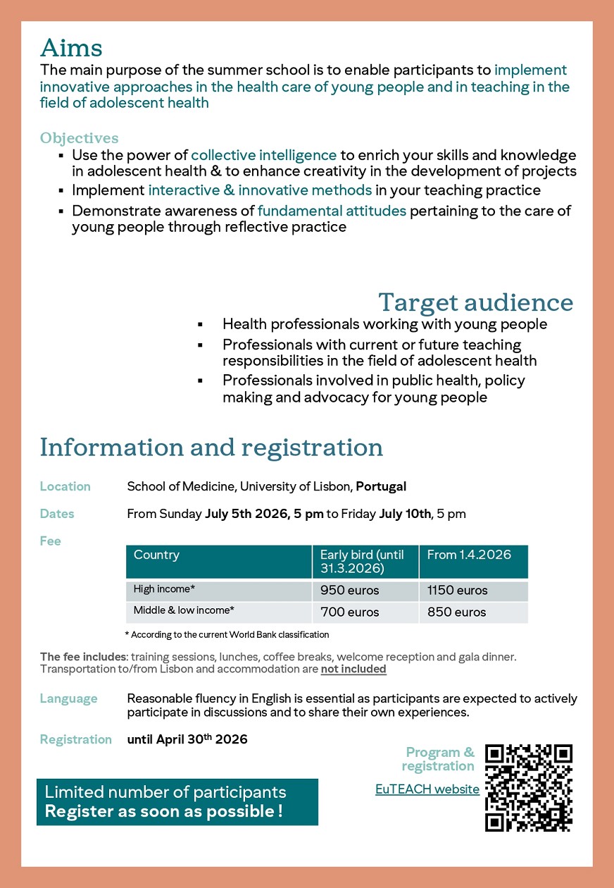 Target audience: Health professionals working with young people - Professionals with current or future teaching responsibilities in the field of adolescent health - Professionals involved in public health, policy making and advocacy for young people.