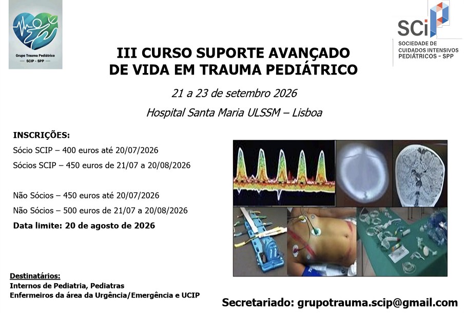 Resumo: Neste curso presencial, com duração de 3 dias serão realizadas bancas de treino de competências e cenários de simulação em diferentes contextos de trauma, para treino prático da abordagem inicial e estabilização da criança vítima de trauma grave. Um mês antes do curso presencial será fornecido suporte bibliográfico em formato digital, para uma melhor preparação teórica para a avaliação final e um maior aproveitamento do curso prático.