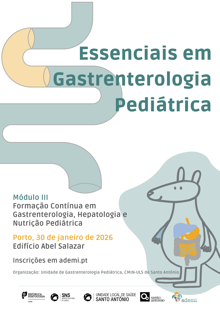 Resumo: O curso Essenciais em Gastrenterologia Pediátrica, organizado pela Unidade de Gastroenterologia Pediátrica do Centro Materno Infantil do Norte decorrerá a 30/01/2026, no Edifício Abel Salazar do ICBAS/UP. este curso destina-se a médicos internos e especialistas de Pediatria e Medicina Geral e Familiar e pretende oferecer uma abordagem prática dos principais desafios no diagnóstico e gestão de crianças e adolescentes com patologia gastrointestinal na infância, desde a abordagem de sintomas e patologias comuns, até à gestão de intercorrências em doentes com patologia crónica em contexto de urgência.