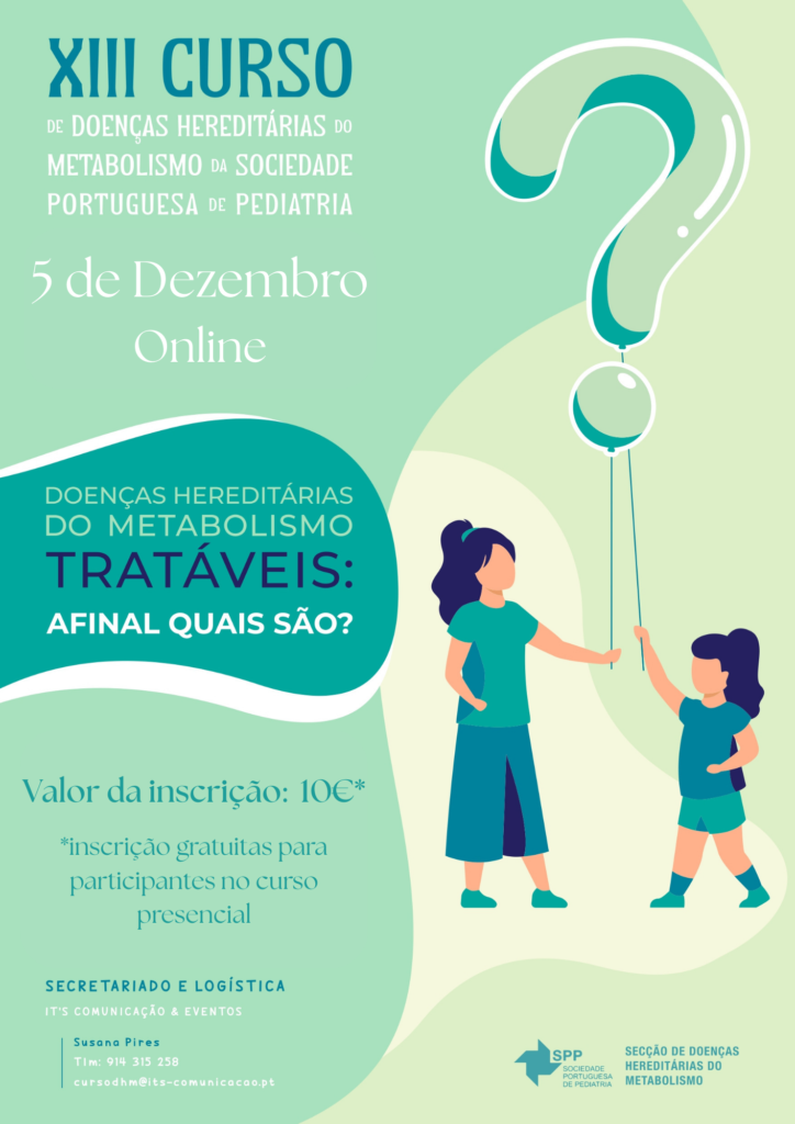 Resumo: A secção de Doenças Hereditárias do Metabolismo (SDHM) da Sociedade Portuguesa de Pediatria (SPP), tem como principais objetivos aprofundar, desenvolver e divulgar os conhecimentos sobre as Doenças Hereditárias do Metabolismo, a Pediatras e outros profissionais de saúde envolvidos nos problemas de saúde infantil. Anualmente a SDHM realiza um curso de formação dedicado especialmente a Pediatras, Internos de Pediatria e Médicos de Medicina Geral e Familiar que se interesse pelas Doenças Metabólicas. À semelhança do que aconteceu em 2024, este ano o curso vai acontecer em duas versões, no dia 30 de maio no Porto realiza-se a versão presencial e, no final do ano, em data a definir, a versão em formato online. O tema da formação é Doenças Hereditárias do Metabolismo tratáveis: afinal quais são?, terá uma duração aproximada de 7 horas, divididas entre apresentações de conteúdos científicos, discussão de casos clínicos, terminando com um teste de avaliação.